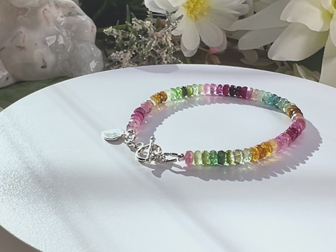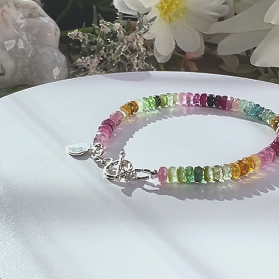 This bracelet is made up of roundel, faceted AAA Watermelon Tourmaline beads with sterling silver accents. It is finished with a sterling silver toggle and heart charm.