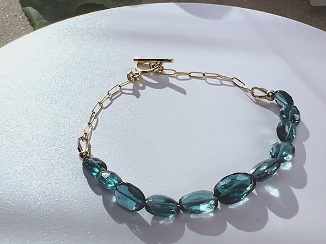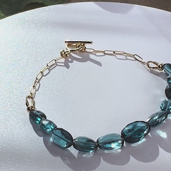 This bracelet is made up of faceted oval London Blue Topaz beads with 14k Gold-Filled Accents and dainty paperclip chain. It is finished with a 14k Gold-Filled toggle clasp.