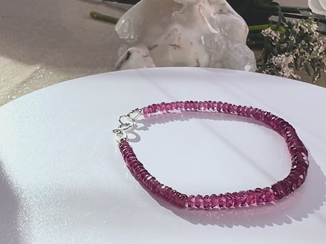 This bracelet is made up of roundel, faceted Purple Garnet beads with sterling silver accents. It is finished with a sterling silver spring ring closure.